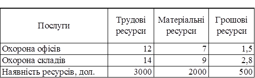 Отже, оптимальна структура виробництва: 111 заявок на охорону офісів і 119 - охорону складів, що приносить максимально можливий доход: F = 230 ∙111 + 240∙119 = 54090 грн.