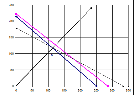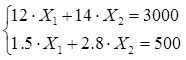 12 ·X1 + 14 · X2 ≤ 3000 7 ·X1 + 9 · X2 ≤ 2000 1,5 ·X1 + 2,8 · X2 ≤ 500 Оптимальний асортимент відповідає точці А на діаграмі, рис.3.3. Для точного пошуку оптимального плану необхідно розв’язати систему рівнянь: