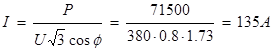 де Розрахувавши значення струму за формулами (4.1) чи (4.2) і порівнявши його значення із граничними величинами для даного перерізу, визначають, чи перевантажені провідники. Визначимо необхідну марку провідника для вентиляційної системи з вентилятором потужністю Р = 71,5 кВт. Напруга в мережі U = 380 В. Розраховуємо силу струму за формулою (4.2):