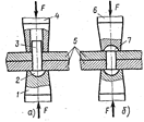 Рис. 9. Схема клёпки: 1-поддержка, 2-закладная головка, 3-стержень заклёпки, 4-натяжка, 5-соединяемые детали, 6-обжимка, 7-замыкающая головка. выми установками Обжимки изготовляют из инструментальной стали У8 или У8А, твердость их рабочей части 56—58 НiС9. Натяжка (см. рис. 9 а) представляет собой цилиндрический стержень, на одном конце которого выполнено глухое отверстие, диаметр которого больше диаметра стержня заклепки на 0,3 мм. С помощью натяжки осаживают склепываемые детали вокруг заклепки (перед ее расклепыванием). Поддержка удерживает заклепку в рабочем положении и позволяет плотно прижать закладную головку к склепываемым деталям. Масса поддержки, используемой при ручной клепке, должна в 3—5 раз превышать массу молотка. Выполнение сборочных работ требует применения и других инструментов, например плоскогубцев, острогубцев и т. п., а также различных приспособлений.