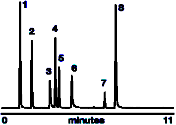 Хроматограмма анализа жирорастворимых витаминов: 1. Витамин А 8. a -каротин
