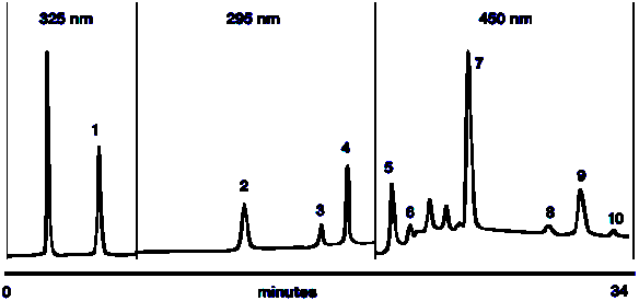 Достоинства хроматографа "Хромос ЖХ-301": -высокая стабильность и точность поддержания расхода элюента обеспечивается конструкцией насосов высокого давления. -легкий доступ к колонкам обеспечивается конструкцией прибора. -эффективность разделения обеспечивается применением высокоэффективных хроматографических колонок. -широкий линейный диапазон измерительного сигнала детекторов без переключений предела измерения, что позволяет с высокой точностью измерять пики как большой, так и малой концентрации. Хроматограмма анализа водорастворимых витаминов: