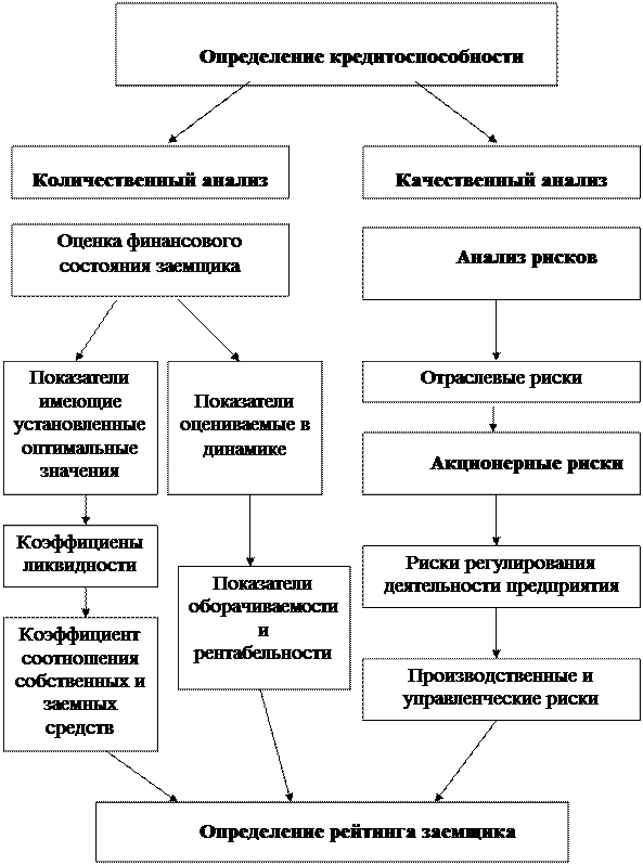 Все предъявленные клиентом банку документы на получение ссуды тщательно изучаются банком и анализируются. В процессе их анализа банком оцениваются статус заемщика, его финансовое положение и кредитоспособность, объект кредитования, конечный экономический или социальный эффект от кредитования объекта, статус и платежеспособность организации-гаранта, возможность возврата ссуды в срок и уплаты процентов по ней. Для оценки финансового состояния заемщика используются: