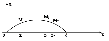 называется волновым уравнением. К исследованию этого уравнения приводит рассмотрение процессов поперечных колебаний струны, продольных колебаний стержня, электрических колебаний в проводе, крутильных колебаний вала, колебаний газа и т.д. 1.1.1. Уравнение колебаний струны. В математической физике под струной понимают гибкую, упругую нить. Напряжения, возникающие в струне в любой момент времени, направлены по касательной к ее профилю. Пусть струна длины Будем рассматривать малые отклонения точек струны от начального положения. В силу этого можно предполагать, что движение точек струны происходит перпендикулярно оси Ox и в одной плоскости. При этом предположении процесс колебания струны описывается одной функцией