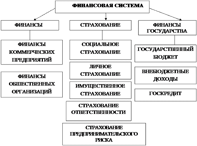 . Поскольку финансы являются носителем распределительных отношений, то это распределение происходит, прежде всего, между различными субъектами. Поэтому в общей совокупности финансов, образующих финансовую систему, выделяются три основные сферы (не считая домашних хозяйств): — Финансы предприятий, учреждений, организаций. Финансы предприятий представляют собой денежные отношения, связанные с формированием и распределением денежных доходов и накоплений у субъектов хозяйствования и их использованием на выполнение обязательств перед финансово-банковской системой и финансирование затрат по расширенному производству, социальному обслуживанию и материальному стимулированию работающих; — Страхование. Значительная часть финансовой системы, связанная с перераспределением денежных средств, поступающих от юридических и физических лиц. Такая деятельность связана с наличием вероятности наступления внезапных, непредвиденных и непреодолимых событий, влекущих за собой нанесение ущерба, который впоследствии «раскладывается» между участниками страхования; — Государственные финансы. Представляют собой денежные отношения по поводу распределения стоимости общественного продукта и части национального богатства, связанные с формированием финансовых ресурсов государства и его предприятий и использованием государственных средств на затраты по расширению производства, удовлетворению растущих социально-культурных потребностей членов общества, нужд обороны страны и управления. Финансовая система характеризуется не только составом входящих в нее частей, но и потоками финансовых ресурсов (финансовыми потоками), связывающими главных агентов финансовых отношений. Такими агентами следует считать государственный бюджет, предприятия и предпринимательские структуры, домашние хозяйства. Кроме того, финансовые потоки связывают этих агентов с кредитной системой и с иностранными государствами в лице их правительств, фирм, фондов, банков. В результате возникает система взаимных финансовых связей и потоков, в упрощенном виде изображенная на рисунке 2. Рисунок 2 Схема финансовых связей в экономике