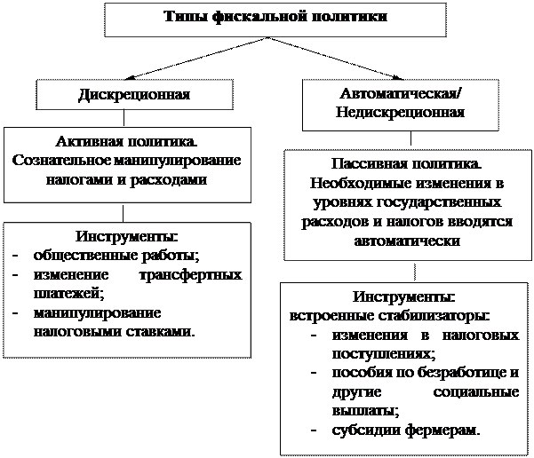 Рисунок 3 Цели фискальной политики § 2.2. МЕТОДЫ РЕГУЛИРОВАНИЯ ЭКОНОМИКИ Современная фискальная политика определяет основные направления использования финансовых ресурсов государства, методы финансирования и главные источники пополнения казны. В зависимости от конкретно-исторических условий в отдельных странах такая политика имеет свои особенности. Вместе с тем используется общий набор мер. Он включает прямые и косвенные финансовые методы регулирования экономики. К прямым методам относятся способы бюджетного регулирования. Средствами государственного бюджета финансируются: - затраты на расширенное воспроизводство; - непроизводительные расходы государства; - развитие инфраструктуры, научных исследований и т.п.; - проведение структурной политики; - содержание военно-промышленного комплекса и т.п. С помощью косвенных методов государство воздействует на финансовые возможности производителей товаров и услуг и на размеры потребительского спроса. Важную роль здесь играет система налогообложения. Изменяя ставки налогов на различные виды доходов, предоставляя налоговые льготы, снижая необлагаемый минимум доходов и т.п., государство стремится добиться, возможно, более устойчивых темпов экономического роста и избежать резких взлетов и падений производства. К числу важных косвенных методов, содействующих накоплению капитала, относится политика ускоренной амортизации. По существу, государство освобождает предпринимателей от уплаты налогов с части прибыли, искусственно перераспределяемой в амортизационный фонд. § 2.3. ТИПЫ ФИСКАЛЬНОЙ ПОЛИТИКИ В зависимости от характера использования прямых и косвенных финансовых методов экономическая наука различает два типа фискальной политики государства: - дискреционную; - недискреционную.