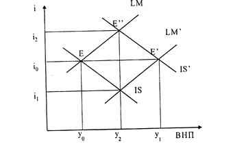 Рисунок 6 Денежное приспособление фискальной политики Фискальная экспансия сдвигает кривую IS до уровня IS ' и сдвигает равновесие из точки Е в точку Е". При высоком уровне дохода растет спрос на деньги, ставка процента увеличивается от i 0 до i 2 , посредством чего вытесняются инвестиционные расходы. Но ЦБ может приспособить фискальную экспансию, выпустив больше денег. На рисунке это отражено сдвигом кривой LM до LM ' и новой точкой равновесия Е'. Ставка процента остается на уровне i 0 и уровень продукта возрастает до i 1 . Теперь понятно, что и денежная фискальная политика может быть использована для расширения совокупного спроса и увеличения национального продукта. Итак, при растущем предложении денег наблюдается сдвиг кривой LM вниз вправо, снижение ставки процента, рост совокупного спроса. С другой стороны, можно использовать экспансионистскую фискальную политику, сдвигающую кривую IS вверх вправо. Альтернатива между денежной и фискальной политикой как инструментами стабилизационной политики - это сложный вопрос. Важно рассмотреть, как они влияют на рост совокупного спроса. В этом отношении существует отчетливое различие между денежной и фискальной политикой. Денежная политика оказывает воздействие при стимулировании процентно зависящих компонентов совокупного спроса, особенно инвестиционных расходов. Убедительное доказательство этому - быстрый и сильный эффект влияния денежной политики на жилищное строительство. Фискальная политика, напротив, оказывает воздействие через покупку государством товаров и услуг или через изменение налогов и трансфертов (под госрасходами здесь понимаются оборонные расходы, снижение налогов на прибыль корпораций, отчислений на соцобеспечение). Рассмотрим влияние составляющих фискальной политики на ключевые переменные. Один из интересных случаев - инвестиционные субсидии, когда государство субсидирует инвестиции, таким образом, как бы оплачивая часть расходов каждой фирмы на инвестиции, т. е. при каждом уровне процента фирмы теперь планируют больше инвестиций (рис. 7а). Рисунок 7 Влияние инвестиции на ВНП