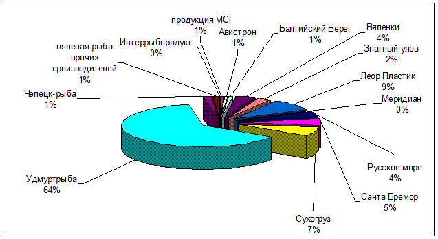 Рис. 5 Долевой процент каждой ассортиментной группы предлагаемой ООО «Рыбзавод №1» Наиболее широкий товарный ассортимент представлен торговой маркой «Удмуртрыба» производства ОАО «Удмуртский хладокомбинат», он включает в себя 8 ассортиментных групп, в которые входят 127 позиций (см. рис. 6).