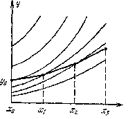 Варианты объектов управления: W(p)=K4/((T4*p+1)*(T5*p+1)*(T6*p+1)) W(p)=K4/(T42 *p2 +2*η*T4*p+1) W(p)=K4/(p*(T4*p+1)*(T5*p+1)) W(p)=K4/(p*(T42 *p2 +2*η*T4*p+1)) W(p)=K4/((T4*p+1) (T52 *p2 +2*η*T5*p+1)) W(p)=K4/((T4*p+1)*(T5*p+1)) W(p)=K4/(p*(T4*p+1)) Передаточная функция: W(p)=K6 1. Решение дифференциальных уравнений методом Эйлера 1.1 Описание метода Уравнения, содержащие производные от функции, возникают при решении многих научно-технических задач, причем существует большое разнообразие классов подобных уравнений. Для решения некоторых из них могут быть использованы аналитические методы, рассматриваемые в курсах математики, однако в большинстве случаев приходится применять численные методы. Сначала рассмотрим один из простейших классов дифференциальных уравнений, на примере которого будут показаны особенности использования численных методов. Пусть задано дифференциальное уравнение первого порядка с начальным условием (задача Коши) dy / dx = F ( x , y ), (1) У(x0 ) = Уо (2) где F ( x , y ) – заданная функция двух переменных x и у , x0 , у0 – известные числа. Требуется определить функцию у = у(x) при х=> x 0 . Уравнение (1) можно рассматривать как задание кривой через ее производную в координатной плоскости x, у , поскольку известно как вычислить производную в каждой точке этой кривой через ее координаты. В общем случае уравнению (1) удовлетворяет целое семейство кривых; начальное условие (2) позволяет выбрать из этого семейства одну определенную кривую, которая проходит через заданную точку x 0 , y 0 . Для численного решения (1) , (2) заменим область непрерывного изменения аргумента х дискретным множеством точек, т.е. введем сетку. Положим, что величина х изменяется от значения х= x 0 до значения х= b . Тогда, рассматривая равномерную сетку, получаем узловые точки x0 , x 1 ,… xk ,… b , находящиеся на расстоянии h друг от друга, т.е. xk +1 - xk = h , k =0,1... , (3) где h – шаг сетки. Соответствующие значения функции будем обозначать уk , т.е. yk = y *( xk ). Здесь у* (х) – функция, которая является приближенным решением (1), (2). Для получения численного решения, дифференциальное уравнение (1) заменяется уравнениями относительно значений функций у*(x) в узловых точках. Эти уравнения называются разностными. Простейшее разностное уравнение для (1) имеет вид ( yk +1 - yk )/ h = F ( xk , yk ) k =0, l ,... , (4) Уравнение (4) следует из (1), если производную dy/ dx приближенно представить через значения функции у(x) в соседних узлах. Соотношения (2.12.4) можно записать в виде Yk +1 = yk + h * F ( xk , yk ). (5) Тогда, учитывая (2), с помощью формулы (5) можно последовательно определить значения у1 ,y2 , .… Этот метод приближенного решения (1), (2) называется методом Эйлера. Геометрическая интерпретация этой схемы дана на рис.1 , где изображено поле интегральных кривых. Использование только первого члена формулы Тейлора означает движение не по интегральной кривой, а по касательной к ней. На каждом шаге мы заново находим касательную; следовательно, траектория движения будет ломаной линией. Из-за этого метод Эйлера иногда называют методом ломаных.