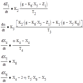 Итак, составим программу для решения дифференциальных уравнений и построения графиков переходных процессов. Сначала сделаем некоторые переобозначения: F — массив значений правых частей F[1]=dZ1 /dt F[2]=X6 F[3]=dα/dt F[4]=dX4 /dt F[5]=dX6 /dt Y0 — начальные значения переменных системы уравнений Y — массив переменных системы уравнений Y[1]=Z1 Y[2]=X5 Y[3]= α Y[4]=X4 Y[5]=X6 2. Листинг программы Входные параметры: * T0 * 0 * TK * 30 * h * 0.01 * Y0 * 0 0 0 0 0 * T * 1 2 1 1 1 * k * 1 1 1 1 1 * g * 1 * n * 0.5 ******** 2.1. Главная программа programEler; uses mdd, graph; begin start(ymin,ymax,t0,tk,t,k1,k2,k3,k4,t1,t2,t3,h,g,y0,y); output1; while t<=tk do begin Eu(g,k1,k2,k3,k4,k6,t1,t2,t3,t4,d,t,h,m,y0,F,y,Gr); abc (Gr, ymin, ymax); output(t,y) end; readln; begline; start2(t0,t,y0,y); top(ymin,ymax,t0,tk,shg,hi,bx,by); while t<=tk do begin Eu(g,k1,k2,k3,k4,k6,t1,t2,t3,t4,d,t,h,m,y0,F,y,Gr); draw(Gr,t,shg,hi,bx,by,h); end; finish(t0,tk,ymin,ymax,shg,hi,bx,by); readln end. 2.2 . Модуль unit MDD; interface {описание структуры программы} usesgraph; const m=5; m2=5; type mass=array [1..m] of real; {массивдифференциалов} mass2=array [1..m2] of real; {массивпереходныхпроцессов} var y0, y, F: Mass; Gr: Mass2; f1,e: text; i,grdriver,grmode:integer; g,n,u4,k3,k4,t1,t2,t3,T4,T5,d,k6,k1,k2,h,ymin,ymax,t0,tk,t, shg,hi,bx,by,i1:real; s:string[8]; procedure start (var ymin, ymax,t0, tk, t,k1,k2,k3,k4,t1,t2, t3,h,g:real;var y0,y:mass); procedure start2 (var t0,t: real; var y0,y: mass);Procedure Eu (var g,k1, k2,k3,k4,t1,t2,t3, u4, k, d, t, h: real; m:integer; var y0, F, y: mass; var Gr: mass2); Procedure R (var y0, F: mass; g,k1,k2,k3,k4,k6,t1,t2,t3,t4,n: real); procedure graphiks (var Gr: mass2; y, y0: mass; g,k1,k2,k3,k4,k6,T1,T2,T3,T4,n: real); procedure begline; procedure abc (Gr: mass2; var ymin,ymax:real); procedure top (ymin,ymax,t0,tk: real; var shg,hi,bx,by: real); procedure draw (Gr: mass2; t,shg,hi,bx,by,h: real); procedure finish (t0,tk,ymin,ymax,shg,hi,bx,by: real); procedure output1; procedure output (t: real; y: mass); implementation procedure start (var ymin,ymax,t0,tk,t,k1,k2,k3,k4,t1,t2,t3,h,g:real;var y0,y:mass); {начальныеприсвоения} begin assign (f1, 'C:\nu.txt'); assign (e, 'C:\Result.txt'); reset (f1); readln(f1);