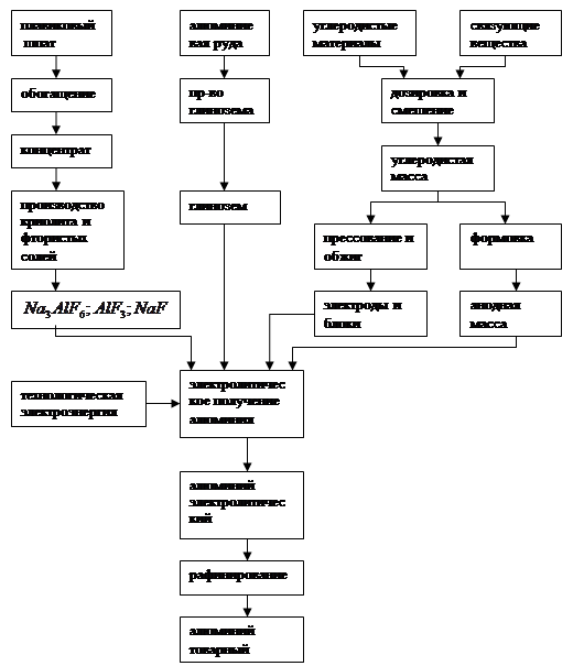 являются производства глинозема и алюминия. Территориально они обычно разделены. Вследствие высокой энергоемкости процесса электролитического восстановления алюминия алюминиевые заводы располагаются в районах с дешевой электроэнергией ГЭС. Производства глинозема, наоборот, базируются в местах добычи алюминиевых руд с тем, чтобы сохранить расходы на перевозку сырья. Производство фтористых солей и криолита ставит целью получение растворителя для глинозема и добавок, снижающих температуру плавления электролита. Организация отдельного производства угольных изделий вызвана тем, что в процессе электролиза угольные аноды и футеровка электролизеров расходуются и требуют непрерывного пополнения.