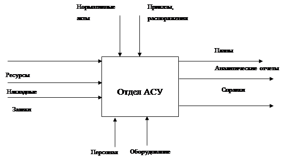 Рисунок 1.3 – Функциональная модель деятельности отдела АСУ Основные участники процесса учета, анализа и планирования оргтехники на предприятии: - инженер по обслуживанию оргтехники; - менеджер по закупке материальных ресурсов; - бухгалтер; - заведующий отделом обслуживания оргтехники. В настоящее время на предприятии один сотрудник может выполнять несколько ролей, например инженер по обслуживанию оргтехники может совмещать функции обслуживания оргтехники с функциями закупки оборудования и комплектующих изделий. Поскольку учет оргтехники инженером АСУ ведется не только по компьютерам, но и по его комплектующим и установленному программному обеспечению, то инженеру АСУ приходится вести большой объем учетной информации, для чего он использует в настоящее время табличный редактор Excel. Как результат, учет инженером АСУ ведется неполный, не все операции по замене запчастей своевременно регистрируются. Отсутствуют аналитические возможности, что не позволяет эффективно размещать и использовать имеющиеся ресурсы оргтехники. Отсутствие средств автоматизации учета парка ресурсов оргтехники не позволяет в полном объеме проводить своевременный учет и контроль состояния ресурсов компьютерного парка. Отсутствие аналитических возможностей в существующей системе учета ресурсов компьютерного парка лишает руководство возможности аргументировано планировать обновление и расширение компьютерного парка – оно выполняется от случая к случаю и необоснованно. 1.2 Характеристика комплекса задач, задачи и обоснование необходимости автоматизации Отдел АСУ проводит работы по созданию, эксплуатации и развитию автоматизированных систем управления совместно с другими отделами предприятия. Бизнес-процессы отдела АСУ были промоделированы, а модели приведены в приложении 1. Взаимодействие, отдела осуществляется по следующим каналам: - с руководителями ООО «Эком» и другими предприятиями через директора и начальника отдела АСУ; - с подрядными и сторонними организациями - через начальника отдела АСУ; - с отделами предприятия – непосредственно через самих сотрудников и начальника отдела АСУ, в соответствии с должностным уровнем лиц, обменивающихся информацией. При внедрении и эксплуатации задач отдела АСУ взаимоотношения с подразделениями предприятия осуществляются на основе совместно составленных планов, графиков работ, инструкций по передаче, обработке и выдаче информации и т.п., в которых определены порядок и сроки выполнения конкретных работ, а также ответственность сторон за качество и достоверность представляемой информации. Взаимодействие отдела АСУ с обеспечивающими отделами ООО «Эком» осуществляется в соответствии с их функциями наравне со всеми технологическими подразделениями предприятия. Для совершенствования системы управления отдел АСУ получает от отделов и руководства ООО «Эком»: - заявку на автоматизацию функций управления (основанием для разработки и внедрения задач служит утвержденная руководством станции заявка с обоснованием необходимости и экономической целесообразности автоматизации функции управления); - систематизированные данные, необходимые для совместного составления технического задания на разработку, информацию, необходимую для решения задач, по установленной форме; - согласованные 