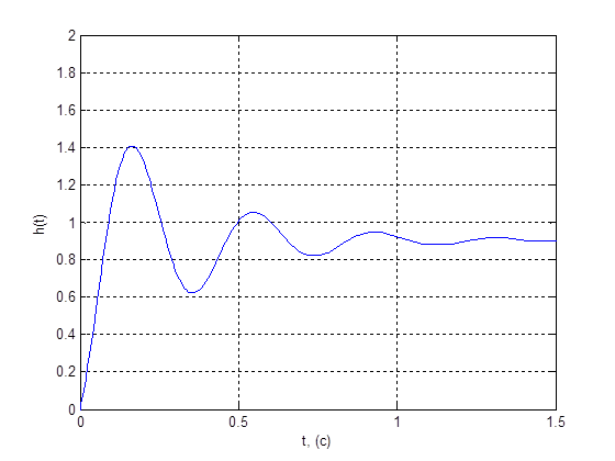 Рис. 13. Графики эталонной и реальной переходных характеристик для разных значений параметра Приложение. Программа 1. Решения уравнения методом Стеффенсена. function Stefens clc e=10.^-5; x=-20; x1=0; i=0; As=0.0125*(x.^3)+0.3*(x.^2)+4.886*x+61.72; x=x-(As.^2)./((0.0125*((x+As).^3)+0.3*((x+As).^2)+4.886*(x+As)+61.72)+As); As=0.0125*(x.^3)+0.3*(x.^2)+4.886*x+61.72; A(1)=x; i=i+1; while abs(x-x1)>e x1=x; x=x-(As.^2)./((0.0125*((x+As).^3)+0.3*((x+As).^2)+4.886*(x+As)+61.72)+As); As=0.0125*(x.^3)+0.3*(x.^2)+4.886*x+61.72; A(i+1)=x; i=i+1; end plot(1,A(1)); hold on for n=1:i plot(n,A(n),'b-o') end grid on xlabel('iteraciya') ylabel('roots') disp('ответ'); disp(x); disp('число итераций'); disp(i); Программа 2. Решение дифференциального уравнения численным способом. clc a2=24; a1=390.88; a0=4937.6; b2=0; b3=0; b1=230.88; b0=4617.6; f1=b2; f2=b1-a1*f1; f3=b0-a1*f1-a2*f2; B=[f1;f2;f3] A=[0 1 0; 0 0 1;-a0 -a1 -a2] h=0.02; Xt=[0;0;0]; X(1,1)=Xt(1); X(1,2)=Xt(2); X(1,3)=Xt(3); F=A*Xt+B; % Разгонный метод K1=h*F;t(1)=0; K2=h*(F+K1/3); K3=h*(F+K2/6+K1/6); K4=h*(F+K1/8+3/8*K2); K5=h*(F+K1/2-3/2*K3+2*K4); Xt=Xt+(1./6)*(K1+4*K4+K5); X(2,1)=Xt(1); X(2,2)=Xt(2); X(2,3)=Xt(3); t(2)=t(1)+h; F=A*Xt+B; i=2; %Неявный метод второго порядка while t(i)<1.6 X1(1)=X(i-1,1); X1(2)=X(i-1,2); X1(3)=X(i-1,3); Xt=Xt+(h./12)*(5*B+8*(A*Xt+B)-(A*X1'+B)); Xt=((eye(3)-(5./12)*h*A)^-1)*Xt; X(i+1,1)=Xt(1); X(i+1,2)=Xt(2); X(i+1,3)=Xt(3); t(i+1)=t(i)+h; i=i+1; end h=0.9352-0.0629*exp(-17.6849*(t))-(0.8723*cos(16.4082*(t))-0.2357*sin(16.4082*(t))).*exp(-3.1576*(t)); for j=1:i V(j)=X(j,1); end E=h-V; plot(t,V,t,h,t,E); grid on Программа 3. Анализа заданной системы с использованием спектрального метода. syms t T; Kx=(4937.6./2)*(t-T).^2-390.88*(1./2)*(-2*(t-T))+24; Ky=(4617.6./2)*(t-T).^2-230.88*(1./2)*(-2*(t-T)); for i=0:9 F6=0; for j=0:i m=i; K=(sqrt(1.1552)*exp(-(1.1552*t)./2)); F=(factorial(m))./(factorial(m-j)); F1=((-1.1552*t).^j); F2=(factorial(j)).^2; F3=K.*F; F4=F1./F2; F5=F3.*F4; F6=F6+F5; L(i+1)=F6; end end for i=0:9 F6=0; for j=0:i m=i; K=(sqrt(1.1552)*exp(-(1.1552*T)./2)); F=(factorial(m))./(factorial(m-j)); F1=((-1.1552*T).^j); F2=(factorial(j)).^2; F3=K.*F; F4=F1./F2; F5=F3.*F4; F6=F6+F5; L1(i+1)=F6; end end G=L'*L1; In=Kx*G; r=int(In,T,0,t); Cx=int(r,t,0,1.5); In=Ky.*G; r=int(In,T,0,t); Cy=int(r,t,0,1.5); A=((Cx+eye(10))^-1)*Cy; Cy=int(L,t,0,1.5); Cx=A*Су' function H=fun(t) Cx=[-0.1275; 0.5090; 0.2483; 0.0697; -0.0459; -0.1140; -0.1472; -0.1555; -0.1468; -0.1275]; for i=0:9 F6=0; for j=0:i m=i; K=(sqrt(1.1552)*exp(-(1.1552*t)./2)); F=(factorial(m))./(factorial(m-j)); F1=((-1.1552*t).^j); F2=(factorial(j)).^2; F3=K.*F; F4=F1./F2; F5=F3.*F4; F6=F6+F5; L(i+1)=F6; end end H=(Cx'*L'); Программа 3. Минимизация функционала. functionK=minF(X) % Kn=X(1); % Ku=X(2); % Kd=X(3); X=[0.7; 0.7; 0.7]; Kn=X(1); Ku=X(2); Kd=X(3); clc %--ПЕРЕМЕННЫЕ--% e=0.0001; l=1; t=0; h=0.001; J1=1; J=0; J2=-1; I=11; I1=32; alph=-10; Xe=1-exp(alph*t); H=eye(3); H1=H; Kn1=Kn+10^-3; Kd1=Kd+10^-3; Ku1=Ku+10^-3; X1=[Kn1;Ku1;Kd1]; while (abs(J1-I)>e) %--ГРАДИЕНТ--% X3=[Kn;Ku;Kd]; U=Dif2([X3]); J1=0; i=1; t=0; while (t<2) J1=J1+(1-exp(alph*t)-U(i))^2; t=t+h; i=i+1; end X3=[Kn+10^-3;Ku;Kd]; U=Dif2([X3]); J=0; i=1; t=0; while (t<2) J=J+(1-exp(alph*t)-U(i))^2; t=t+h; i=i+1; end g1=(J-J1)/10^-3; X3=[Kn;Ku+10^-3;Kd]; U=Dif2([X3]); J=0; t=0; i=1; while (t<2) J=J+(1-exp(alph*t)-U(i))^2; t=t+h; i=i+1; end g2=(J-J1)/10^-3; X3=[Kn;Ku;Kd+10^-3]; U=Dif2([X3]); J=0; t=0; i=1; while (t<2) J=J+(1-exp(alph*t)-U(i))^2; t=t+h; i=i+1; end g3=(J-J1)/10^-3; I1=J; GradJ=[g1;g2;g3]; %--НОВОЕ ЗНАЧЕНИЕ Х--% X1=X1-l*H*GradJ; X=X1; Kn1=X(1); Ku1=X(2); Kd1=X(3); Kn=Kn1; Ku=Ku1; Kd=Kd1; X3=[Kn;Ku;Kd]; U=Dif2([X3]); J1=0; i=1; t=0; while (t<2) J1=J1+(1-exp(alph*t)-U(i))^2; t=t+h; i=i+1; end X3=X1+[10^-3;0;0]; U=Dif2([X3]); J=0; t=0; i=1; while (t<2) J=J+(1-exp(alph*t)-U(i))^2; t=t+h; i=i+1; end g11=(J-J1)/10^-3; X3=X1+[0;10^-3;0]; U=Dif2([X3]); J=0; t=0; i=1; while (t<2) J=J+(1-exp(alph*t)-U(i))^2; t=t+h; i=i+1; end g21=(J-J1)/10^-3; X3=X1+[0;0;10^-3]; U=Dif2([X3]); J=0; t=0; i=1; while (t<2) J=J+(1-exp(alph*t)-U(i))^2; t=t+h; i=i+1; end I=J; g31=(J-J1)/10^-3; GradJ1=[g11;g21;g31]; U1=GradJ1-GradJ; V=l*H*GradJ; A=(V*V')/(V'*U1); B=-(H*U1*U1')/(U1'*H*U1); H1=H+A+B; if J1>I l=min_lz(X,l,H,GradJ); X1=X; end X=X1; Kn1=X(1); Ku1=X(2); Kd1=X(3); Kn=Kn1; Ku=Ku1; Kd=Kd1; end Kn Ku Kd function la=min_l(X,l,H,GradJ) b=1; a=0; e=0.05; x4=10; x2=a+(-1+sqrt(1+4*(b-a)))/(2); while (abs(x2-x4)>e) x4=a+b-x2; F2=X-x2*H*GradJ; F4=X-x2*H*GradJ; if norm(F2)<norm(F4) b=x4; else x2=x4; a=x2; end end X=[0.43101603658062 0.78399472393963 0.05296602599762]; Kn=X(1); Ku=X(2); Kd=X(3); a4=693/693; a3=(160000*Kd+16632)/693; a2=(110880+160000*Kn+3200000*Kd)/693; a1=(160000*Ku+221760+3200000*Kn)/693; a0=3200000*Ku/693; b4=0; b3=160000*Kd/693; b2=(3200000*Kd+160000*Kn)/693; b1=(3200000*Kn+160000*Ku)/693; b0=3200000*Ku/693; H=tf([b4 b3 b2 b1 b0],[a4 a3 a2 a1 a0]); h=tf([10],[1 10]); ltiview(H,h); function Xre=Dif2(X) Kn=X(1); Ku=X(2); Kd=X(3); a4=693/693; a3=(160000*Kd+16632)/693; a2=(110880+160000*Kn+3200000*Kd)/693; a1=(160000*Ku+221760+3200000*Kn)/693; a0=3200000*Ku/693; b4=0; b3=160000*Kd/693; b2=(3200000*Kd+160000*Kn)/693; b1=(3200000*Kn+160000*Ku)/693; b0=3200000*Ku/693; f0=b4; f1=b3-a3*f0; f2=b2-a2*f0-a3*f1; f3=b1-a1*f0-a2*f1-a3*f2; f4=b0-a0*f0-a1*f1-a2*f2-a3*f3; B=[f1;f2;f3;f4]; A=[0 1 0 0; 0 0 1 0; 0 0 0 1; -a0 -a1 -a2 -a3]; h=0.001; Xt=[0;0;0;0]; X(1,1)=Xt(1); X(1,2)=Xt(2); X(1,3)=Xt(3); X(1,4)=Xt(4); F=A*Xt+B; % Разгонный метод K1=h*F;t(1)=0; K2=h*(F+K1/3); K3=h*(F+K2/6+K1/6); K4=h*(F+K1/8+3/8*K2); K5=h*(F+K1/2-3/2*K3+2*