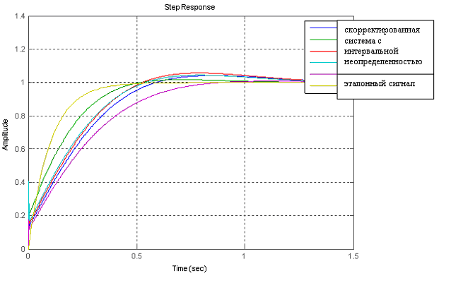 Рис.12. Графики переходных характеристик системы 3. Синтез робастного регулятора матричным методом. Одним из возможных и перспективных способов решения задачи синтеза регуляторов является использования метода матричных операторов. Достоинством данного метода является возможность его применения для различных классов систем, в том числе нелинейных и нестационарных. Рассмотрим линейную систему без неопределенности, описываемую в форме матричных операторов: Очевидно, что для линейной системы без неопределенности справедливы следующие зависимости: Получаем следующую формулу расчета спектральной характеристики выходного сигнала: Спектральная характеристика невязки между эталонной и реальной переходными характеристиками имеет вид: