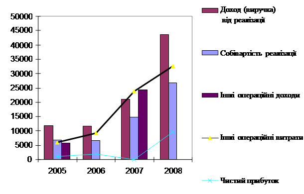 Рис. 1.4. Динаміка ключових статей пасивів ТОВ УВЦ «Галактика-С» за період 2005-2008 рр. Аналіз основних фінансових результатів підприємства можна здійснювати за допомогою форми №2 «Звіт про фінансові результати» (додаток Б). Абсолютні показники ключових статей Звіту ТОВ УВЦ «Галактика-С» за період з 2005 по 2008 рр. представлені в таблиці 1.3. Як свідчать дані Звіту про фінансові результати підприємства, протягом останніх трьох років відбулося помітне зростання виручки від реалізації. Так, за 2008 рік підприємство одержало 43 620 тис. грн. виручки, що на 31 773 тис. грн. більше, ніж у 2005 році, тобто виручка виросла в більше ніж в 3,5 рази. На 2008 рік припадає і найбільший темп росту цього показника порівняно з попереднім періодом (за 2008 рік вона зросла майже вдвічі). Таблиця 1.3 Абсолютні показники основних фінансових результатів ТОВ УВЦ «Галактика-С» в 2005-2008рр.