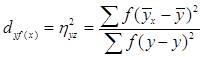 де η – кореляційне відношення; Sv – сума квадратів відхилення за варіантами; Sy – загальна сума квадратів. Кореляційне відношення використовується для оцінки криволінійної форми зв’зку між ознаками і має додатній знак, змінюється від 0 до 1. При малому числі спостережень кореляційне відношення обчислюється: