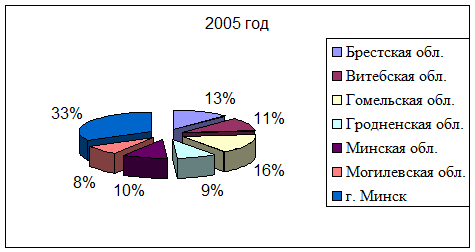 Рисунок 1. Состав товарооборота общественного питания П р и м е ч а н и е. Источник: [ 4, c. 23, таблица 2.1] 1.2. Развитие розничного товарооборота общественного питания в Республике Беларусь Розничный товарооборот общественного питания в 2005 г составил 1278681 млн. руб. При этом наибольшая доля в общем объеме товарооборота по республике приходится на г. Минск (33 %) и Гомельскую область (16 %), наименьшая – на Могилевскую область (8 %). По сравнению с 2004 годом увеличилась доля товарооборота по г. Минску – 2 процентных пункта, по гомельской области произошло снижение – 2 процентных пункта (приложение А, рисунки 2 и 3).