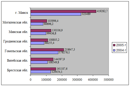 Рисунок 4 . Развитие розничного товарооборота по регионам Республики Беларусь, млн. руб. П р и м е ч а н и е. Источник: собственная разработкаПри этом отмечаются незначительные изменения в структуре розничного товарооборота по областям. По республике удельный вес продукции собственного производства за 2005 г составил 72 % (на уровне прошлого года). Выше среднереспубликанского уровня этот показатель отмечается в Могилевской области -82,1 %, Гродненской области- 75,0 %, г Минске –72,3 %. По Брестской области этот показатель на 8,4 % ниже установившегося по стране (приложение Б). По данным Министерства статистики и анализа по состоянию на 1 января 2005 г в республике насчитывалось 10033 объекта общественного питания, из них 9678 на 686966 посадочных мест. По сравнению с 2005 г количество организаций увеличилось за год на 1345 организаций, а общее изменение количества посадочных мест составило 69652 места. Наибольший рост количества объектов общественного питания отмечается по Витебской (385) и Брестской (278) областях. По Гродненской области количество организаций питания не изменилось по сравнению с прошлым годом и составило 1185 организаций, при этом отмечается сокращение посадочных мест в действующей сети на 4730 (приложение В). Общее количество ресторанов составило 403 объекта (4 %), кафе- 1556 (15,5 %), столовых –5105 (50,9 %), баров – 978 (9,7 %) (приложение Г). Наибольшее количество ресторанов и кафе находится в г. Минске – соответственно 124 и 282 объекта (приложение Г). Из действовавших на 1 января 2005 года организаций общественного питания 4061 объекта (или 40,5%) на 356773 посадочных места – организации государственной формы собственности. Наиболее широко организации общественного питания государственной формы собственности представлены в Гомельской (42,5 %) и Минской (34 %) областях, в г. Минске (40,3 %). При этом наиболее быстрыми темпами по сравнению с частными (в том числе иностранными) организациями питания товарооборот организаций питания государственной собственности вырос в Брестской области (118,0 % против 114,7 % частного сектора), Гродненской (117,7 % против 112,8 %) и г. Минску (116,8 и 112,8) (приложение Д). На долю организаций питания коммунальной собственности в 2005 г приходится 202237,7 млн. руб. или 15,8 %; по Минску оборот организаций общественного питания коммунальной собственности составил 55190,7 млн. руб. или 13,2 % от общего товарооборота по Минску (приложение А). По состоянию на 1 января 2004 г. в производственных организациях находилось 19 % всей сети общественного питания республики, при учебных организациях – 35 %, в общественной сети – 41 %. То есть сеть социально ориентированных объектов общественного питания, в которых на продукцию собственного производства применяется самая низкая минимальная наценка 30-40 %, составляла почти 55 %. 1.3. Планирование товарооборота в организациях общественного питания 1.3.1. Значение и особенности планирования товарооборота в общественном питании В настоящее время субъекты торговли, осуществляющие общественное питание, самостоятельно планируют хозяйственно-финансовое и социальное развитие. Процесс планирования позволяет увидеть весь комплекс будущих операций по осуществлению стабильного развития организации питания, позволяет предугадать направления развития организации. При этом ключевым показателем плана организации общественного питания традиционно считается
