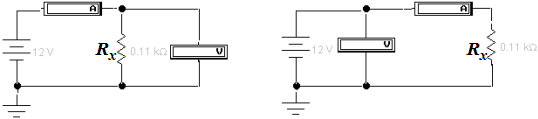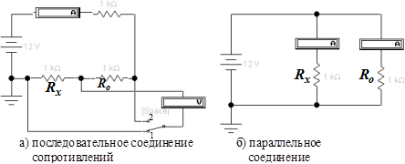Однако при этом возникает методическая погрешность измерения сопротивления (то есть погрешность, обусловленная методом измерения) вследствие шунтирующего влияния сопротивления вольтметра при измерении тока в первой схеме (рис. 3а) и влияния внутреннего сопротивления амперметра при измерении напряжения во второй схеме (рис. 3б). Измеренное значение сопротивления по схеме рис. 3а будет определяться выражением