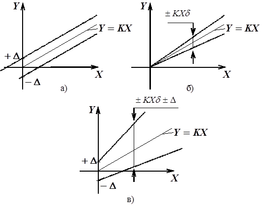 Рис. 2. Виды погрешностей по характеру изменения в диапазоне измерений: а) аддитивная полоса погрешностей; б) мультипликативная полоса погрешностей; в) полоса погрешностей при совокупности аддитивной и мультипликативной составляющих Поскольку при изменении