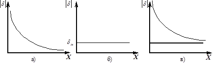 Рис. 3. Вид относительной погрешности прибора: а) при аддитивной полосе; б) при мультипликативной полосе; в) при совокупности аддитивной и мультипликативной составляющих Если положение границ полосы погрешностей имеет вид, показанный на рис. 2б, т.е. ширина полосы возрастает пропорционально входной величине