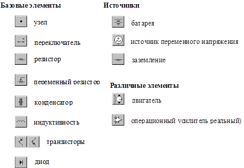 Рис. 8. Пиктограммы наиболее часто используемых элементов Формирование схемы 1) Переместить компоненты из панели элементов. 2) Поместить их в область окна. 3) Как только компоненты помещены в рабочую область окна, Вы можете соединить их проводами. Для этого: * поместите стрелку мыши на контакт одного из элементов и нажмите левую кнопку - высветится темный квадрат; * удерживая кнопку, перемещайте мышь - появится провод; * протяните провод на контакт другого компонента. Когда контакт высветится, отпустите кнопку мыши. Провод автоматически соединит два контакта. Чтобы соединить два провода, используйте узел (черная точка в панели элементов). Узел может соединить четыре провода, один на каждой стороне. Чтобы вставлять компонент в провод, переместите его на провод и отпустите кнопку мыши. 4) Использование прибора: 4.1) Переместить пиктограмму прибора к рабочей области окна. 4.2) Присоединить пиктограмму прибора к схеме. 4.3) Щелкнуть на пиктограмме прибора, чтобы увидеть сам прибор. 4.4) Перетащить прибор, зацепив его за заголовок при необходимости (если прибор собой что-либо закрыл). 4.5) Скорректировать средства управления приборами. Органы управления имеют вид реальных органов управления. Каждый прибор различен, но имеются некоторые общие принципы для установки средств управления. Если на приборе имеются кнопки, выберите нужную и активизируйте ее, щелкнув на ней. Изменения значений параметров настройки: * Нажать вверх и вниз по стрелкам около значения. * На некоторых приборах Вы можете напечатать новое значение. Чтобы удалить прибор, переместите пиктограмму обратно к верхней части дисплея (откуда Вы ее взяли). 5) Активизировать схему Как только Вы сформировали схему, ее можно активизировать. Чтобы активизировать схему, нажмите переключатель питания в верхнем правом углу дисплея. Вы можете также активизировать ее, нажав CTRL+G. Когда моделирование закончено, переключатель питания выключается автоматически и результаты теста отображаются на приборах, присоединенных к схеме. Чтобы остановить активацию, нажмите переключатель питания или выберите STOP или Pause из меню CIRCUIT. Изменение параметров элементов схемы Для изменения параметров любого из элементов схемы (резистора, транзистора, диода, операционного усилителя и т.д.) необходимо выполнить на нем двойной щелчок: