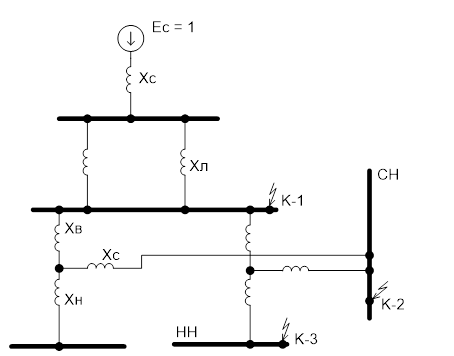 Рис 3.2. Заступна схема для розрахунку струмів к.з. Розрахунок струму к.з. на стороні ВН.