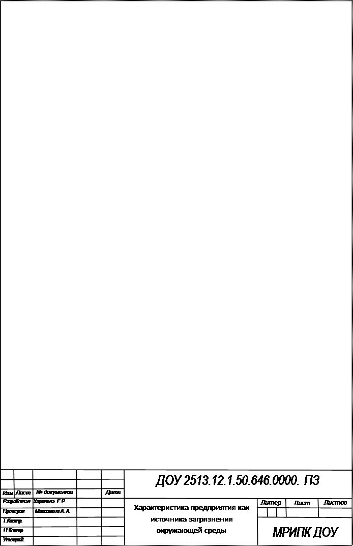 СОДЕРЖАНИЕ ВВЕДЕНИЕ 1. ОБЩИЕ СВЕДЕНИЯ О ПРЕДПРИЯТИИ 2. ХАРАКТЕРИСТИКА ПРЕДПРИЯТИЯ КАК ИСТОЧНИКА ЗАГРЯЗНЕНИЯ ОКРУЖАЮЩЕЙ СРЕДЫ 3. НОРМИРОВАНИЕ АНТРОПОГЕННОГО ВОЗДЕЙСТВИЯ НА ОКРУЖАЮЩУЮ СРЕДУ. 3.1.РАСЧЕТ НОРМАТИВОВ ОБРАЗОВАНИЯ ОТХОДОВ. 3.2. РАСЧЕТ ВЫБРОСОВ ЗАГРЯЗНЯЮЩИХ ВЕЩЕСТВ В АТМОСФЕРНЫЙ ВОЗДУХ. 4. ОПРЕДЕЛЕНИЕ САНИТАРНО- ЗАЩИТНОЙ ЗОНЫ САНПИН ЗАКЛЮЧЕНИЕ СПИСОК ИСПОЛЬЗОВАННЫХ ИСТОЧНИКОВ