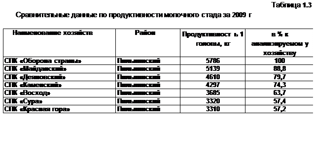 Максимальный уровень продуктивности 1 коровы в СПК «Оборона страны» составляет 5786 кг, минимальный 4994, размах вариации равен 792 кг. Максимальное поголовье коров молочного стада за анализируемый период 509 голов. Максимальный уровень затрат на 1 голову составил 43550 руб., минимальный 17241 руб., размах вариации равен 26309 рубля. Помимо данных о размере произведенной продукции очень важно знать, во что обошлась эта продукция, то есть ее себестоимость. Производственные затраты, включаемые в себестоимость продукции (работ, услуг), классифицируют по различным признакам. Основные затраты непосредственно связаны с процессом производства продукции: корма, издержки на содержание основных средств, оплату труда производственных рабочих и другие расходы, кроме общепроизводственных и общехозяйственных расходов. По способу отнесения на себестоимость продукции все затраты делятся на прямые и косвенные. Прямые затраты осуществляются на производство конкретного вида продукции; их относят на соответствующие ее виды (стоимость семян, кормов, топлива и смазочных материалов, , удобрений и т. д.). Накладные затраты образуются в связи с организацией, обслуживанием производства и управлением им. Они состоят из общепроизводственных и общехозяйственных расходов. При анализе состояния животноводства и его продуктивности следует иметь в виду, что хозяйства имеют различные почвенные, климатические и производственные условия. Продуктивность земли по хозяйствам и районам неодинакова. Необходимо также иметь в виду различия в отношении пахотных и других сельскохозяйственных угодий. Таблица 1.9