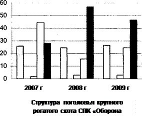 В составе поголовья крупного рогатого скота в СПК Оборона страны» преобладают коровы, быки-производители, нетели, телки старше 2-х лет, а также молодняк всех возрастов. Наибольший удельный вес в структуре поголовья крупного рогатого скота имеет молодняк всех возрастов, который составляет от 28,1 % в 2007 году, 56,8 % в 2008 году, 46,4 % в 2009 году. В структуре поголовья 2009 г 718 голов коров, или 26,3 %. Численность поголовья крупного рогатого скота в СПК «Оборона страны» непрерывно меняется вследствие получения приплода, покупки, продажи, падежа и других причин. Поэтому наряду с данными по поголовью, необходимо исчислять среднее поголовье скота за месяц, квартал, год. В сельхоз предприятиях ведется постоянный учет поголовья животных, заведующие фермами ведут Книгу маточного поголовья скота и Книгу учета движения скота. Все изменения в численности и составе скота на фермах оформляются соответствующими первичными документами и заносятся в указанные книги учета. Общее поголовье всех групп и видов скота нельзя определить простым суммированием, так как животные существенно отличаются по стоимости, по весу, потребности в кормах. Возобновление и рост поголовья скота в хозяйстве происходит главным образом путем получения приплода. Часть скота хозяйства могут приобретать со стороны. Под воспроизводством стада понимают постоянное возобновление стада путем получения и выращивания приплода и замены ремонтным молодняком выбывших животных. Одновременно с количественными изменениями в стаде происходят и качественные изменения: улучшается породный состав, растет продуктивность. Воспроизводство стада может быть расширенным и простым. При простом воспроизводстве численность скота к концу года не увеличивается. Расширенное воспроизводство означает рост поголовья. Для выполнения заданий по увеличению производства продукции животноводства хозяйства должны обеспечивать расширенное воспроизводство стада, т. е. неуклонный рост поголовья. Воспроизводство стада заключается не только в получении приплода и его выращивании, но и обеспеченности стада ремонтным молодняком и производителями, переводе молодняка в старшие возрастные группы. Поэтому учет изменений количества скота и изучение процессов воспроизводства стада является очень важной задачей статистики животноводства. В численности скота непременно происходят изменения в результате приплода, выбраковки на забой, падежа, перевода из младших возрастных групп в старшие. Для отражения этого движения скота в хозяйствах составляют оборот стада по группам на начало периода, поступление и выбытие за период, и численность на конец года. Таблица 1.5 Показатели воспроизводства скота в СПК «Оборона страны»