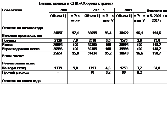 В составе площадей кормовых культур в СПК «Оборона страны» кормовая площадь в 2009 году составляет 2054 га. Площадь естественных сенокосов и пастбищ в хозяйстве в 2007 г была 200 га, в 2009 г 140 га. В молочном скотоводстве основными процессами, связанными с производством молока, являются: -кормление животных, включая подвоз, подготовку к скармливанию и раздачу кормов; - доение коров и уход за доильным оборудованием; - первичная обработка и хранение молока; - уборка и утилизация навоза; - создание оптимального микроклимата в помещениях. В комплексе факторов, влияющих на продуктивность, на первом месте стоит кормление. От выбора типа кормления зависит не только наиболее полное проявление потенциала продуктивности, но и эффективность использования имеющегося кормового фонда. Кормление нормируют исходя из удоя, живой массы, возраста и физиологического состояния коров. При этом предусматривается общая потребность животных в питательных веществах, выраженная в кормовых единицах, потребность в перевариваемом протеине, в основных минеральных веществах (кальций, фосфор, поваренная соль) и каротине. Кормовые рационы составляют в соответствии с нормами, исходя из имеющихся кормов. Количество и виды кормов подбирают с учетом потребности животных в основных питательных веществах. Российская кормовая индустрия демонстрирует высокий уровень зависимости от конъюнктуры соответствующих сырьевых рынков. Основным видом сырья для производства комбикорма является фуражное зерно. С этим связана высокая взаимозависимость комбикормовой и зерновой отраслей. Среди важнейших видов зерна, используемых на фуражные цели, представлены: пшеница, ячмень, кукуруза и рожь. Кроме того, комбикормовая индустрия является потребителем различных зерновых отходов, в том числе отрубей. Весомую долю в структуре комбикорма в стоимостном отношении занимают различные добавки и высокобелковые компоненты. Признанным мировым лидером среди основных источников протеина по большинства/ основных показатели является соевый шрот. Производство данного вида сырья в нашей стране ограничено климатическими и географическими факторами. Это ставит отечественное животноводство в зависимость от импортных поставок сои и соевого шрота. Общий объем производства продукции животноводства еще не полностью характеризует уровень развития этой отрасли. Показатели же выхода продукции на 100 га сельскохозяйственных угодий дает возможность сравнивать одно хозяйство с другим, а также проводить подобные сравнения по районам, областям, республикам. Продукция сельского хозяйства учитывается в натуральном выражении и в денежной оценке. Учет продукции в натуральном выражении дает представление о размерах производства. Молоко принимается на молокозаводы по весу с указанием фактической жирности и в пересчете на молоко в базисной жирности.