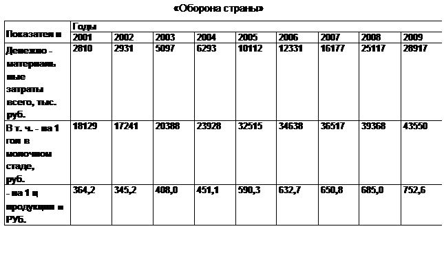 Расчет прогнозируемой себестоимости составлен из расчетов 1 главы произведенных методом экстраполяции. При затратах труда на 1 ц молока в размере 2,34 чел часа повышается продуктивность 1 головы при этом увеличивая себестоимость 1 ц молока на 52,35 руб. за счет качественных кормовых рационов. Выводы и предложения В СПК «Оборона страны» валовое производство молока в 2009 году составляет 38422 ц, что больше, чем в 2001 году на 30707 ц. Объем производства молока возрос вследствие увеличения поголовья молочного стада более чем в четыре раза, со 155 голов в 2001 год до 664 головы в 2009 году, а также за счет увеличения молочной продуктивности 1 коровы с 4977 кг до 5786 кг. Показатели воспроизводства стада характерны выходом телят на 100 маток. Выход телят на 100 маток в СПК «Оборона страны» имеет тенденцию роста с 64,6 % в 2007 году до 84,9 % в 2009 году. Обеспеченность коров нетелями и телками старше 2-х лет в СПК достаточный для замены коров и снижается за анализируемый период от 217,6% до 75,4%. В СПК «Оборона страны» падеж скота составляет в среднем 7-9,1 %, соответственно сохранность скота более 90 %, так как этот показатель сохранности скота обратен показателю падеж скота. В среднем по Пильнинскому району выход телят составляет 88,4 % или от каждой сотни коров получено 88 голов телят. Падеж равен 7,3 %. Сохранность поголовья составляет 92,7 %. Показатели затрат труда на производство 1 ц молока в СПК «Оборона страны» за анализируемый период с 2002 по 2009 год постепенно снижаются. Если в 2002 году на производство 1 ц молока в СПК было затрачено 4,95 чел часа, в 2009 году 2,34 чел. часа. Среднегодовой коэффициент роста составляет 0,911. Денежно материальные затраты на корма в СПК «Оборона страны» в 2007 году составляли 6372 тыс. руб., что в расчете на 1 корову 14383,7 руб. и в расчете на 1 ц молока 256,35 руб. В 2009 году эти показатели стали выше, так затраты на корма в 2009 году составили всего 15782 тыс. руб., в расчете на 1 корову 23768,1 руб. изменение составляет 165,2 %, и на 1 ц молока 410,75 руб. или изменение составляет 160,2 %. Денежно материальные затраты на оплату труда в СПК «Оборона страны» за анализируемый период возросли на 24,7 %, в том числе на 1 корову денежно материальные затраты снижены с 7767,5 руб. в 2007 г до 6462,3 руб. в 2009 г или на 16,8 %. на 1 ц молока снижение составляет 26,75 руб. или 19,3 %. Экономические результаты производства и реализации молока в СПК «Оборона страны» выражены увеличением объема реализованного молока за анализируемый период на 50,7 %, соответственно и денежной выручкой от реализации молока на 31,1 %. Одновременно наблюдается увеличение полной себестоимости молока на 70,3 %. За анализируемый период объем реализации возрос, денежная выручка тоже, но прибыль от реализации молока снижена с 7742 тыс. руб. в 2007 году до 3732 тыс. руб. в 2009 г или более чем в два раза. В виду снижения полученной прибыли от продажи молока наблюдается снижение прибыли на 1 ц проданного молока на 68,0 %. Рентабельность производства молока снижена на 34,8 %, продажи на 33,8 %. В группировке по совокупности 33 хозяйств в связи с увеличением удоя молока на 1 корову наблюдается снижение затрат труда на 1 ц молока и наблюдается увеличение количества молока, произведенного за 1 чел час, то есть повышение производительности труда и снижение трудоемкости. Расчет прогнозируемой себестоимости составлен из расчетов 1 главы произведенных методом экстраполяции. При затратах труда на 1 