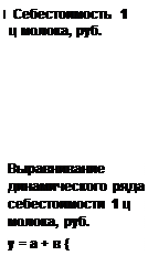 8 а + 36 в = 4039,57 36 а + 204 в = 20377,07 где: а и в - неизвестные параметры I - порядковый номер года у - выровненное значение динамического ряда Проведем решение уравнения: 8 а + 36 в = 4039,57 8 а = 4039,57 - 36 в 8а = 8 (504,95-4,5 в) а = 504,95-4,5 в 36 х (504,95 - 4,5 в) + 204 в = 20377,07 18178,20 - 162 в + 204 в = 20377,07 8 а + 36 х 52,35 = 4039,57 8 а = 4039,57 - 1884,60 Ставим данные в линейное уравнение и получаем: у = 269,37 + 52,35 х 1 = 321,72. Согласно уравнения видим, что себестоимость 1 ц молока в СПК «Оборона страны» за анализируемый период с 2002 г по 2009 год повышалась в среднем на 52,35 руб. в год.