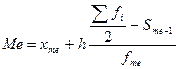 где xme – нижняя граница медиального интервала; h – величина интервала; Σfi – сумма частот распределения; Sme -1 – сумма частот домедиальных интервалов; fme – частота медиального интервала