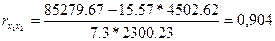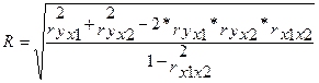Вычтем из второго уравнения системы первое: -426,6=-6988,16а2 а2 =0,06 Подставив а2 в уравнения системы, найдем а1 и а0 а1 =-19,92 а0 =336,66 В результате решения данной системы на основе исходных данных по 19 предприятиям получаем следующее уравнение регрессии: Y=336,66-19,92x1 +0,06x2 Коэффициент регрессии а1 =-19,92 показывает, что при увеличении урожайности на 1 ц с га себестоимость 1 ц зерна снижается в среднем на 19,92 руб. (при условии постоянства уровня интенсивности затрат). Коэффициент а2 =0,06 свидетельствует о среднем увеличении себестоимости 1 ц зерна на 0,06 руб. при увеличении уровня затрат производства на 1 руб. в расчете на 1 га посева зерновых (при постоянстве урожайности). Теснота связи между признаками, включаемыми в модель, может быть определена при помощи коэффициентов множественной корреляции: