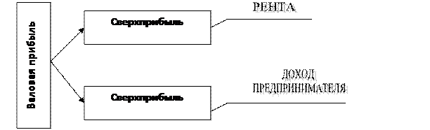 Рис. 1. Источники дохода предпринимателя и собственника земли А. Смит раскрыл существо рентных отношений: «Устанавливая условия договора, землевладелец стремится оставить арендатору лишь такую долю продукта, которая достаточна для возмещения капитала, затрачиваемого им на семена, на оплату труда и покупку и содержание скота, а также остального сельскохозяйственного инвентаря, и для получения обычной в данной местности прибыли на вложенный в сельское хозяйство капитал... Всю ту часть продукта или, что-то же самое, всю ту часть его цены, которая остается сверх этой доли, землевладелец, естественно, стремится удержать для себя в качестве земельной ренты...». Сказанное означает, что земельная рента – это форма экономической реализации собственности на землю. 3. Виды земельной ренты. Особой формой ренты является земельная рента, связанная с аграрными отношениями. Земельная рента выступает как часть прибавочного продукта, создаваемого производителями, хозяйствующими на земле. Сущность земельной ренты в том, что она является экономической формой реализации прав собственности на землю. Различным ступеням общественной жизни соответствуют различные формы земельной ренты: выплата ренты в виде части продуктов – продуктовая рента, отработочная рента (барщина). Последней и высшей формой земельной ренты является денежная земельная рента – продуктовая рента, обращённая в денежную форму. Земельная рента образуется не только в связи с арендой земли для сельскохозяйственного производства, рента имеет место и в тех случаях, когда земля арендуется предпринимателями для постройки зданий и сооружений, разработки её недр. Земельная рента выступает в двух основных формах – абсолютной и дифференциальной, что обусловлено существованием двух видов монополий на землю: монополии частной собственности на землю и монополии на землю как объект хозяйствования. Размер земельной ренты определяется в результате борьбы между арендатором и земельным собственником. Естественно, что различные участки земли различаются по плодородности, климатическим особенностям, местоположению, и далеко не все из них пригодны к универсальному использованию. По этой причине не все земельные угодья приносят равные доходы в виде земельной ренты. Наиболее распространенной формой земельной ренты является дифференциальная рента. Если учесть неоднородность качества и местоположения земли, то избыток ренты над рентой с худшего из всех используемых участков называют дифференциальной рентой. Образование дифференциальной земельной ренты вызвано различием в плодородии и местоположении земли и эффективности добавочных затрат труда и средств на землю, она возникает как экономическая категория в случае использования любого рода ресурсов, не являющихся полностью однородными. Дифференциация величин земельной ренты выполняет важнейшую экономическую функцию оптимизации распределения земельных участков между возможными сферами их использования. Дифференциальная рента может выступать в двух формах. Арендатор может получить только часть дифференциальной ренты в случае, когда ее прирост обусловлен произведенным им улучшением земельного участка – повышение экономического плодородия почвы – в период действия арендного договора. Такую дифференциальную ренту, с