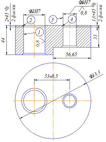 Рис. 1. Шайба ступінчаста. Ескіз Для подальших розрахунків призначимо наступні методи обробки: 1) обточування діаметру ñ 113,3 мм(токарна операція); 2) фрезерування пазу 56,65 мм (фрезерна операція); 3) свердління отворів 1 і 3 (див. рис. 1) – (свердлильна операція); 4) зенкування фасок 2 і 4 (свердлильна операція); 5) зенкерування отворів 1 і 3 (свердлильна операція); 6) розвертання отворів 1 і 3 (свердлильна операція). Для кожного виду обробки вибираємо різальні інструменти, керуючись рекомендаціями [1], виходячи із оброблюваного матеріалу та заданих початкових умов: – для обточування діаметруñ 113,3 – токарний прохідний різець ГОСТ 18878–73 з пластинами з твердого сплаву ВК6 [с. 120, 1]. – для фрезерування пазу 56,65 мм – фреза торцева насадна ø125 ГОСТ 9473–80, матеріал твердосплавних пластин – ВК6, кількість зубів z =12, ширина B = 42 мм [табл. 94, с. 187, 1]; геометричні параметри фрези за ГОСТ 9473–80; – для свердління отворів 1 і 3 – свердла ø18,5 і ø30 ГОСТ 10903–77 [табл. 42, с. 147, 1], матеріал – швидкорізальна сталь Р6М5; – для зенкування фасок 2 і 4 – конічна зенковка ø22, матеріал – швидкорізальна сталь Р6М5; – для зенкерування отворів 1 і 3 – зенкери ø19,9 і ø31,8 ГОСТ 12489–71, матеріал – швидкорізальна сталь Р6М5; – для розвертання отворів 1 і 3 – розвертки ø20 і ø33 ГОСТ 1672–80, матеріал – швидкорізальна сталь Р6М5. 2. Виконання ескізів Ескіз деталі наведений і п. 1 (рис. 1). Ескізи різальних інструментів (свердла та торцевої фрези) подано на рис. 2 і 3.