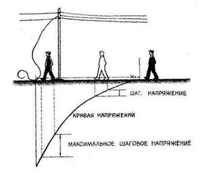 Если человек окажется в зоне растекания тока и будет стоять на поверхности земли, имеющей разные электрические потенциалы в местах, где расположены ступни ног, то на длине шага возникнет напряжение, соответствующее разности этих потенциалов (длина шага равная 0,8 м).