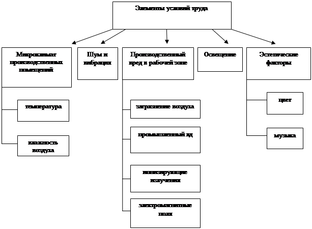 Рис.1 Основные элементы, характеризующие условий труда на производства. Трудовой процесс определяется показателями тяжести и напряженности труда. В общей оценке факторы производственной среды делятся на: · Опасный производственный фактор - это фактор среды и трудового процесса, который может быть причиной острого заболевания или внезапного резкого ухудшения здоровья, и даже смерти. · Вредный производственный фактор - это фактор среды и трудового процесса, который при определенных условиях (интенсивность, длительность и другие) может вызвать профессиональную патологию, временное или стойкое снижение трудоспособности, повысить частоту соматических и инфекционных заболеваний, привести к нарушению здоровья потомства. · Тяжесть труда - это характеристика трудового процесса, отражающая нагрузку на опорно-двигательный аппарат и функциональные системы организма (сердечнососудистую, дыхательную и др.). Показатели тяжести труда - это физическая динамическая нагрузка, масса (вес) поднимаемого и перемещаемого груза, общее число стереотипных рабочих движений, величина статической нагрузки, рабочая поза, наклоны корпуса, перемещения в пространстве. · Напряженность труда - это характеристика трудового процесса, отражающая нагрузку преимущественно на центральную нервную систему, органы чувств, эмоциональную сферу работника и степень ее выраженности. Показатели, характеризующие напряженность труда: интеллектуальные, сенсорные, эмоциональные нагрузки, степень монотонности нагрузок, режим работы, длительность и интенсивность интеллектуальной нагрузки (по специальным шкалам). Если для примера проанализировать условия труда полиграфической промышленности по показателям вредности и опасности факторов производственной среды, тяжести и напряженности трудового процесса, то на основании Приказа Государственного комитета Украины о промышленной безопасности и охране труда от 03 декабря 2007 года № 287 определены правила охраны труда для предприятий и организаций полиграфической промышленности: · Санитарные нормы микроклимата (температура, влажность и скорость движения воздуха) на рабочих местах должны быть в соответствии с требованиями ГОСТ 12.1.005-88 и ДСН 3.3.6.042-99 "Государственные санитарные нормы микроклимата производственных помещений", утвержденных постановлением Главного государственного санитарного врача Украины от 01.12.99 № 42. · Интенсивность инфракрасного излучения от нагретого оборудования и инсоляция на рабочих местах не должна превышать нормы, указанные в ГОСТ 12.1.005-88 ССБТ "Общие санитарно-гигиенические требования к воздуху рабочей зоны" и ДСН 3.3.6.042-99. · Температура поверхностей нагретого оборудования, доступных для прикосновения, не должна превышать 43 Сº, согласно ДСТУ EN 563-2001 "Безопасность машин. Температуры поверхностей, доступных для прикосновения. Эргономичные данные для установления предельных значений температуры горячих поверхностей (EN 563: 1994, IDT)". Нагревательные устройства и элементы оборудования с температурой внешних поверхностей свыше 43Сº необходимо обеспечить тепловой изоляцией или ограждением и нанести на них сигнальную краску согласно ГОСТ 12.4.026-76. · В производственных и вспомогательных зданиях и помещениях следует максимально использовать естественное освещение. · Уровень вибрации, которая дей