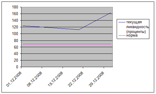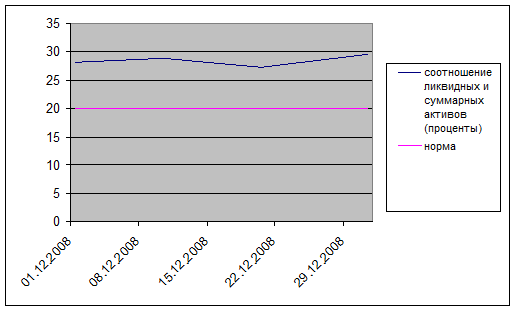 Наглядно динамика показателей ликвидности представлена на рис. Рис. 1 Динамика показателя мгновенной ликвидности (%) Рис. 2 Динамика показателя краткосрочной ликвидности (%) Рис. 3 Динамика показателя соотношения ликвидных и суммарных активов (%) Активы в зависимости от степени кредитного риска подразделяются на нижеприведенные семь групп, для которых устанавливаются следующие степени риска: I группа (со степенью риска 0 процентов); II группа (со степенью риска 20 процентов); III группа (со степенью риска 35 процентов); IV группа (со степенью риска 50 процентов); V группа (со степенью риска 75 процентов) - требования, включенные в розничный портфель; VI группа (со степенью риска 100 процентов); VII группа (со степенью риска 150 процентов). Контроль соблюдения нормативов достаточности капитала осуществляется Национальным банком ежемесячно на основании отчетности, представляемой банками по форме 2801. Расчет собственного капитала ОАО «Банк Москва-Минск» и его достаточности по состоянию на 01.01.2010 г. (см. Приложение 1). В расчете подробно расписано, какой актив в какую группу риска должен быть включен. Следует отметить, что отнесение к каждой группе риска зависит (согласно новым требованиям) не только от степени ликвидности самого актива, но и от рейтинга контрагента (юридического лица, банка), присвоенного ему международными агенствами: Moody's Investors Service, Fitch, Standard & Poor's. Во внимание принимаются рейтинги, присвоенные только этими агенствами. Остальное рассматривается как отсутствие рейтинга. Большое число банкротств и просроченных ссуд привлекли в последние годы повышенное внимание к адекватности банковского капитала. Регулирующие органы требуют роста банковского капитала, чтобы надежнее защитить вкладчиков и обеспечить жизнеспособность страховых фондов. Банкиры предпочитают меньшие нормативы капитала, чтобы поднять прибыльность и рост активов. Эти противоречащие друг другу цели порождают конфликт между политикой надзора и деятельностью банка. Капитал играет важную роль в дилемме риск / доход. Увеличение капитала снижает риск путем стабилизации доходов и их роста, страхуя от банкротства. Но он и уменьшает ожидаемый доход, поскольку акционерный капитал более дорог, чем задолженность. Главные вопросы управления активами и пассивами, таким образом, сводятся к определению оптимальной величины капитала. Банки с более крупным капиталом могут брать взаймы под более низкий процент, предоставлять крупные кредиты и быстрее расширяться за счет приобретений или внутреннего роста. В целом они могут проводить более рискованные инвестиционные операции. Капитал снижает риск банкротства, действуя как резервный запас против убытков и предоставляя доступ к финансовым рынкам для удовлетворения потребности в ликвидности. Собственный капитал банка по общему определению – это имущество банка, свободное от обязательств, собственное имущество (средства) банка. Собственный капитал банка представляет особую форму банковских ресурсов. Он, в отличие от других источников, носит постоянный безвозвратный характер, имеет четко выраженную правовую основу и функциональную определенность, является обязательным условием образования и функционирования любого банка, т.е. служит стержнем, на который опирается вся деятельность банка с первого дня его существования. Обя