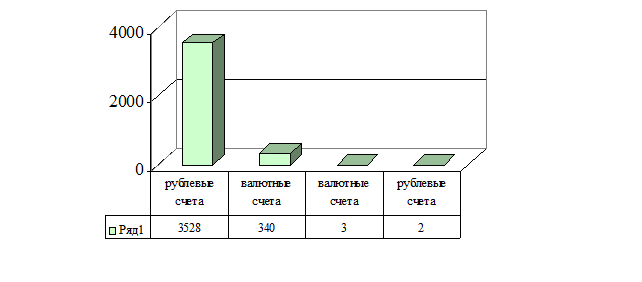 Рис. 2.3. Структура счетов юридических лиц в Арсеньевском отделении Сбербанка, подпадающих под систему валютного контроля Незначительный удельный вес валютных счетов – 9,6% в общем объеме открытых счетов юридических лиц (который практически не меняется на протяжении 2000-2001гг.) объясняется, прежде всего, оттоком в 2000г. значительной части предпринимателей, осуществляющих свою деятельность без образования юридического лица, которые получали экспортную выручку в иностранной валюте по договорам комиссии от юридических лиц (такая ситуация возникла, в связи с выходом разъяснительного письма Центрального банка РФ в котором данный вид расчетов не был признан текущей операцией) , а также низкой активностью клиентов в сфере внешнеэкономической деятельности, предпочитающих работать через комиссионеров в валюте Российской Федерации. Рассмотрев практику совершения операций по открытию и ведению счетов, в соответствии с договором банковского счета, подпадающих под систему валютного контроля, охарактеризуем однородные по типу, но разнообразные по широте предлагаемых банковских продуктов операции по привлечению средств. Основываясь на практическом опыте Арсеньевского отделения Сбербанка, оценим состояние активных валютных операций по размещению привлеченных ресурсов. 2.3. Анализ и динамика операций банка по привлечению и размещению средств юридических и физических лиц Стабилизация политической ситуации, положительные тенденции в экономике России создают основу для расширения инвестиций в реальную экономику и требуют ускорения темпов роста ресурсной базы банка. В качестве основных источников привлечения средств в иностранной валюте Арсеньевское отделение Сбербанка РФ определяет: 1) сбережения населения - главный и наиболее стабильный инвестиционный ресурс; 2) средства юридических лиц – наиболее динамично растущая составляющая пассивов; 3) средства территориального банка – долгосрочный пассив для расширения финансирования инвестиционных проектов. Основными приоритетами при формировании ресурсной базы отделения являются: удлинение сроков привлечения средств, снижение общей стоимости ресурсов, оптимизация структуры привлечения ресурсов по параметрам “цена –срок – риск переоценки или досрочного отзыва”. Операции по привлечению средств физических лиц в иностранной валюте во вклады осуществляется в 14 операционных кассах Арсеньевского отделения, в восьми районах Приморского края. Структурные подразделения отделения принимают вклады на условиях выдачи по первому требованию (до востребования), либо на условиях возврата по истечении определенного договором срока (срочные вклады). Выплата вклада любого вида производится банком по первому требованию вкладчика. Вкладчиками банка могут быть граждане Российской Федерации, иностранные граждане и лица без гражданства, как резиденты, так и нерезиденты. Они вправе иметь в филиале любое количество счетов по вкладам, причем время нахождения средств во вкладе не ограничено. Вклады принимаются только на имя определенного лица. Открытие одного счета по вкладу на имя двух и более лиц не допускается. Вклады могут быть открыты в иностранных валютах стран-ведущих внешнеэкономических партнеров Российской Федерации, котируемых Центральным банком РФ каждый рабочий день. Виды 