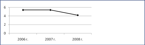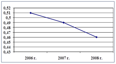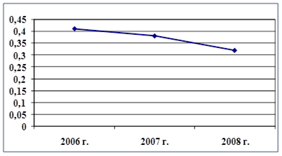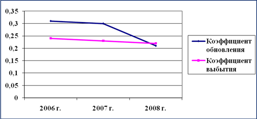 Динамика изменения коэффициента обновления и коэффициента выбытия основных средств за 2006-2008 гг. приведена на рисунке 2.5. В 2006 – 2007 гг. коэффициенты обновления и выбытия основных средств практически не менялись, но в 2008 г. коэффициент выбытия превысил коэффициент обновления, который в свою очередь уменьшился с 0,3 до 0,21. Это объясняется отсутствием достаточного количества денежных средств для обновления основных средств, падением чистой прибыли, ростом кредиторской задолженности по расчетам с поставщиками и подрядчиками. Такое явление носит отрицательный характер, так как доля новых основных средств уменьшается, а, значит, ухудшается техническая оснащенность предприятия. Последнее приводит к ухудшению результатов деятельности. Коэффициент выбытия основных средств остаточно высок, что может быть обусловлено тем, например, что предприятие активно выводит изношенные основные средства, не продолжая использовать их. Результат такого процесса – падение эффективности производства, так как наблюдается тенденция, которая может привести к нехватке основных средств. В течение 2006-2008 гг. коэффициент выбытия основных средств изменялся скачками.