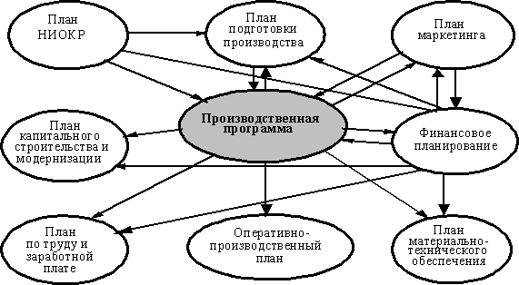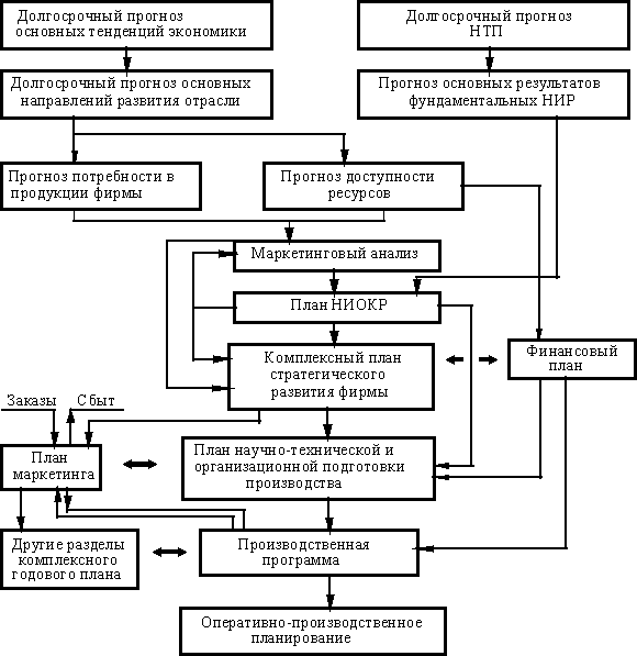 Рис.4 . Система прогнозов и планов предприятия На рис. мы видим, что прогнозы занимают ведущее (исходное) положение во всей системе прогнозов и планов фирмы. По существу между прогнозом (предвидением будущего) и планом нет резкой границы. Можно сказать, что прогноз - недостаточно определенный план, а план - это уточненный прогноз. Наиболее существенным отличием плана от прогноза является наличие в плане элементов выбора, принятия решений и мероприятий по их осуществлению. Как указывалось в рис. , основными объектами прогнозирования на уровне предприятия (фирмы) являются: - потребность в продукции предприятия; - потребности предприятия в производственных ресурсах (материальных, финансовых, трудовых, информационных). Разработкой методов прогнозирования занимается прогностика. Все методы прогнозирования (их более 100) можно разделить на две группы: неформализованные (эвристические) и формализованные. К числу неформализованных относят: - индивидуальные экспертные оценки, - коллективные экспертные оценки, - написание сценариев и т.д. К формализованным методам относят: - методы экстраполяции, - моделирование. Неформализованные (эвристические) методы применяются в тех случаях, когда невозможно использовать знания экспертов в формализованном виде. Наиболее широко используются методы интервью, «мозговой атаки», коллективных экспертных опросов. Очевидно, что деятельности основных сфер фирмы переплетены и зависят друг от друга и от внешней среды. Таким образом, можно говорить о том, что управление фирмой определяется двумя факторами: особенностью производственного процесса и характером внешней среды фирмы. Современная тенденция состоит во все увеличивающемся значении второго фактора. Неотъемлемой частью планирования на предприятии являются нормы и нормативы. Под нормой понимается научно обоснованная мера затрат живого или овеществленного труда на изготовление единицы продукции или выполнение заданного объема работ. Норматив характеризует степень использования ресурса на единицу измерения продукции или работы (на единицу площади, веса и т.д.). Различают нормы (нормативы): - затрат живого труда; - расхода предметов труда (сырья, материалов, топлива и т.д.); - использования орудий труда (машин, оборудования и т.д.); - движения (организации) производства (длительности производственного цикла, времени опережения, партионности и т.д.); - издержек производства (в т.ч. НЗП); - социально-экономические и т.д. Совокупность норм и нормативов представляет собою основу для текущего и перспективного внутрифирменного планирования. На базе этих норм формируются балансы потребления материальных ресурсов, энергобалансы и т.д. По степени детализации различают нормы специфицированные и сводные. По методу разработки: - расчетно-аналитические; - опытные; - опытно-статистические. Вся совокупность норм и нормативов образует нормативное хозяйство фирмы, которое вводится в АСУ и используется для оперативного планирования и управления производством, планирования всех видов деятельности предприятия и организации подготовки производства. Например, при планировании МТС используют удельные затраты материалов на единицу готовой продукции. Норма расхода материала включает: - полезный расход материала; - дополнительные затраты, вызванные технологическим про