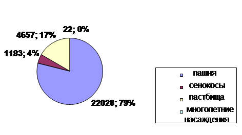 На основании данных таблицы 4 можем сделать вывод, что общая земельная площадь в данном хозяйстве, в том числе и её структура, за последние три года не изменилась. При этом, общая земельная площадь равна площади с.-х. угодий и она используется довольно рационально, так как пашни в общем объеме земельной площади составляют 79%. По данным таблицы построим круговую диаграмму структуры земельной площади. Рис.3. Структура земельной площади ОАО РАО "Алексеевское".