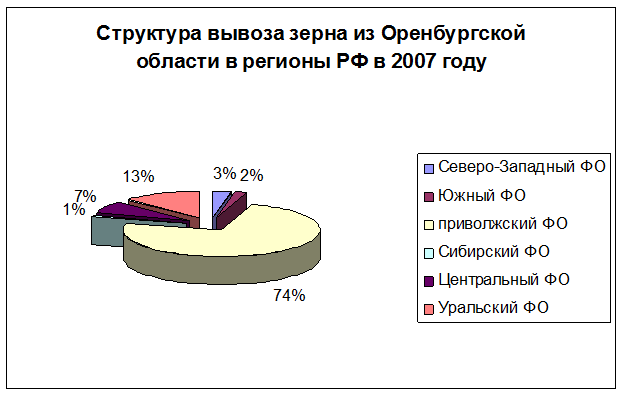 Рисунок 1.2 - Структура вывоза зерна из Оренбургской области в регионы РФ в 2007 году Причины разные. У сельских товаропроизводителей выручка от реализации зерна и другой продукции часто не покрывает затраты из-за высоких цен на ресурсы, приобретаемые в других отраслях экономики, Уровень рентабельности товарного зерна в 2005г. составил всего 4,3% (в 2004г. — 37,4). Диспаритет цен продолжает своё отрицательное влияние на финансовое положение сельскохозяйственных предприятий, фермеров и отдельных частных предпринимателей. Большие надежды возлагаются на кооперацию и интеграцию с промышленными предприятиями и коммерческими структурами. В процессе интегрирования в сельское хозяйство области с 2001г. инвесторами было вложено 5,1 млрд. рублей. Но эти вложения пока не решают возникшие проблемы. Это всего лишь 33 руб. на 1га обрабатываемой площади организаций, вошедших в объединения. [16] Совсем недавно Оренбуржье могло кормить хлебом в течение месяца всё население России, обеспечивая зерном многие регионы страны. Однако в настоящее время роль крупнейшей житницы страны утрачивается, производство зерна стало в большей степени, чем раньше, зависеть от капризов погоды. Это обусловлено падением производительности труда, снижением материальной заинтересованности, нарушениями требований технологии выращивания зерновых, снижением почвенного плодородия и большими потерями урожая в период уборки, хранения и транспортировки. Урожайность зерновых в области на 3— 5 ц/га ниже, чем в соседних регионах (Башкортостан, Татарстан, в Челябинской и Курганской областях). Надежды на фермеров пока не оправдываются — средняя урожайность у них составляет около 9—10 ц/га, а доля в валовом сборе зерна остаётся не более 5%. Цена на белый хлеб в области продолжает расти. Неудовлетворительное финансовое состояние сельских товаропроизводителей как крупных, так и фермерских хозяйств не позволяет им создать необходимые запасы горючего, качественных семян, удобрений, запасных частей и сформировать высокопроизводительные агрегаты. В результате часть пашни остаётся под весновспашку, что недопустимо для засушливого климата Южного Урала, а выращенный урожай часто убирают в растянутые сроки с большими потерями. [30] Изучение сложившихся экономических условий в сельском хозяйстве области и многофакторный анализ на основе уравнений регрессии позволяет прогнозировать динамику основных показателей в зерновом производстве. Однако результаты говорят или о снижение объёмов производства зерна или, в лучшем случае, о стабилизации. Все меньше предпринимателей хотят производить и перерабатывать сельскохозяйственную продукцию. Уровень рентабельности в размере 10—30% в условиях рискованного земледелия не может быть привлекательным для коммерческой деятельности. По нашему мнению, зерновая проблема Оренбуржья не может быть заботой только правительства области — оно входит в число восьми регионов России, остающихся вывозящими сельхозпродукцию, в том числе пшеницу сильных и твердых сортов. Гарантированные закупочные цены должны исчисляться таким образом, чтобы через них сельхозтоваропроизводители могли покрывать расчетную себестоимость и обеспечить прибыль согласно принятому нормативу рентабельности. Расчеты показывают, что гарантированный уровень рентабельности в Ор