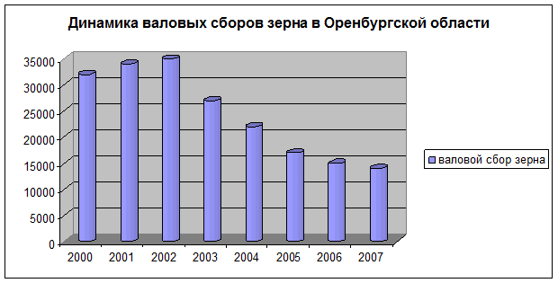Рисунок 1.3 - Динамика валовых сборов зерна в Оренбургской области Значительное количество зерна необходимо для производства комбикормов, на промышленную переработку и создание запасов. К сожалению, основная часть зерна, используемого на корм скоту, идет без переработки, что ведет к неоправданному перерасходу ценной продукции (20— 30%). Вместе с тем комбикормовая промышленность остаётся в кризисном состоянии. Например, Оренбургский комбикормовый завод за десять лет существенно уменьшил выпуск комбинированных сбалансированных по питательным веществам кормов. По нашему мнению, причин здесь несколько. Высокие тарифы на энергоносители, низкий покупательский спрос на комбикорм (отсутствие денег и снижение поголовья скота почти в два раза), падение материальной и моральной заинтересованности в конечных результатах труда. Цена на комбикорм составляет 5—6 тыс. руб. за 1 т, что не соответствует низким финансовым возможностям большинства сельхозорганизаций. В настоящее время рынок зерна и продукции его переработки находится в затянувшейся стадии формирования. Его несовершенство на данном этапе можно показать на основе следующих показателей. Непосредственные производители зерна получают только 31 — 32% от реализации хлеба, остальную часть делят между собой заготовители и переработчики (31—32%), торговля (17—18%), государство (17 — 18%) и транспорт (2—3%). Средняя цена реализации сельскохозяйственными организациями 1 т зерна в 2005г. составила 2933 руб., при себестоимости — 2813 руб., что не обеспечило нормальной прибыли для укрепления производства. Многие хозяйства не смогли рассчитаться за взятые под залог урожая кредиты. Цена определялась не рынком, а посредниками-перекупщиками и монополистами-переработчиками. Вместе с тем мука высшего и первого сорта реализовывалась по высокой цене, и переработчики оказались с хорошей прибылью, а производители зерна еле покрывали издержки (табл. 1.3). Отметим, что переработчики зерна сейчас тоже находятся в затруднительном положении из-за недостатка сырья, инфляции и роста цен на зерно и энергетику. В 2004г. 53% организаций мукомольно-крупяной и комбикормовой промышленности в стране оказались убыточными. За последние три года издержки производства на одном из лучших мелькомбинатов г. Оренбурга — ЗАО «Хлебопродукт-2» увеличились на 37%. Только за счет диверсификации производства, жесткого управления затратами здесь удается обеспечивать рентабельность на уровне 17,5%. Из-за недостатка сырья производственные мощности загружены не полностью. Таблица 1.3 – Обзор рынка зерна по Оренбургской области на 2007 год