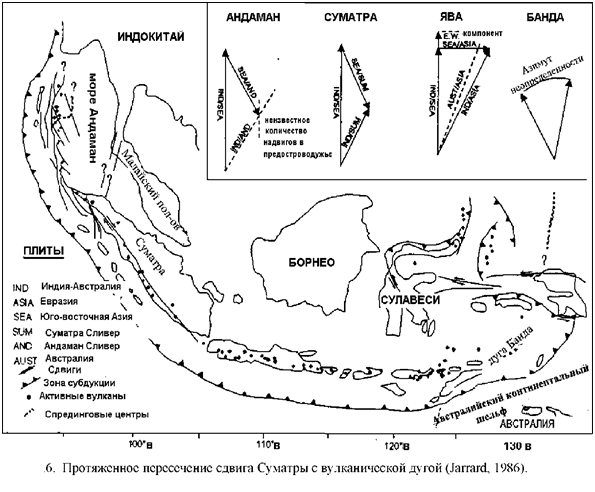 Если вектор углов столкновения плит расположен под углом к углу субдукции, то субдукция является косой, и здесь могут присутствовать сдвиговые разломы с возможными выступами растяжения, особенно, там, где имеются изменения простирания этих разломов. В целом эти разломы будут иметь простирание, почти параллельное вектору столкновения, и они секут островную дугу косо (под углом). Направление их миграции будет таким же, как направление скоса. Если угол субдукции находится справа относительно угла миграции, то направление движения будет правосторонним, и если он располагается слева, то направление движения будет левосторонним (рис. 4b). Ориентация структур растяжения может быть определена, как только будет известно направление миграции (рис. 5). Там, где угол скоса (рис. 4с) большой, наклон зоны субдукции также будет большим. Сдвиговые разломы будут протягиваться параллельно островной дуге и могут перекрывать или простираться рядом с дугой, если имеется высокая степень сцепления между верхней и нижней плитами. К сожалению, только угол скоса может определяться для старых островных дуг. По нему можно лишь прийти к выводу о том, что имеется ли высокая вероятность параллельного наложения сдвиговых разломов, там, где угол скоса превышает 45°, но это не всегда присутствует в случае современных островных дуг. Это наиболее особый случай, когда происходило формирование больших депрессий тыловых дуг. Ситуация, где островная дуга и сдвиг накладываются или простираются параллельно дуге, наблюдается на Суматре, центральных Филиппинах, Колумбии и на юге Чили. Очевидно это очень благоприятная ситуация, поскольку пересечение разломов, которые могут иметь расширяющиеся выступы, и островные дуги максимально похожи (на примере Суматры; рис. 6).