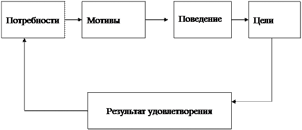 Рисунок 3. Схема мотивационного процесса П р и м е ч а н и е. Источник: [11, c. 311] Представленная схема является довольно условной и дает лишь самое общее представление о взаимосвязях потребностей и мотивов. Реальный же мотивационный процесс может быть значительно более сложным. Мотивы, движущие человеком, чрезвычайно сложны, подвержены частым переменам и формируются под воздействием целого комплекса внешних и внутренних факторов - способностей, образования, социального положения, материального благосостояния, общественного мнения и т.п. Поэтому прогнозирование поведения членов коллектива в ответ на разные системы мотивации весьма затруднительно. Мотивация как функция управления реализуется через систему стимулов, т.е. любые действия подчиненного должны иметь для него положительные или отрицательные последствия с точки зрения удовлетворения его потребностей или достижения его целей. Изучение коллектива может позволить руководителю создать мотивационную структуру, с помощью которой он осуществит воспитание коллектива в нужном направлении. В свое время известный политэконом Дж. Ст. Милль писал: "Я понял, что для того, чтобы стать счастливым, человек должен поставить перед собой какую-то цель; тогда, стремясь к ней, он будет испытывать счастье, не заботясь о нем" [5,c. 169]. Это, утверждал он, составляет смысл психологического закона. Таким образом, мотив — осознанное, являющееся свойством личности побуждение к деятельности, которое возникает при высшей форме отражения потребностей. Мотивы появляются, развиваются на основе потребностей, при этом сохраняя относительную самостоятельность, так как потребность строго не определяет мотив, его силу и устойчивость, при одной и той жепотребности могут возникать разные мотивы. Мотив не определяется потребностью абсолютно. Потребности могут отражаться на разных уровнях: биологическом, физиологическом, социальном. Мотивы же возникают на высшем уровне отражения потребностей — их осознании. По своему значению близким к понятию "мотив" является "стимул", это не редко приводит к их смешению. Под стимулом следует понимать целевые внешние побуждения к деятельности. Стимул может и не превратиться в мотив, если он не будет принят личностью. Поэтому очевидно, что главное для субъекта управления применить такое средство внешнего воздействия, которое превратилось бы в мотив человека, поэтому предмет воздействия должен быть выбран с определенной целью. Итак, в основе деятельности человека лежит многообразие потребностей. Когда потребность находит предмет своего выражения — формируется мотив. У каждого конкретного человека формируется определенная иерархическая система мотивов - мотивационная сфера личности. Мотивация имеет место тогда, когда актуализируется определенный мотив и человек направляет свои усилия - умственные и физические - на его достижение. Обычно выделяют три вида мотивации: прямая, властная и опосредованная. Прямая мотивация представляет собой непосредственное воздействие на человека с целью формирования желательной системы мотивов. При этом могут применяться следующие средства: убеждение, пропаганда, личный пример. Властная мотивация базируется на угрозе ухудшения удовлетворения потребностей работника в случае ненадлежащего выполнения обязанностей. Она реали