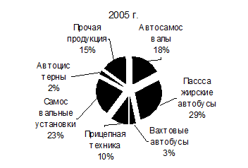 Таким образом, основной выпускаемой продукцией на ОАО «НефАЗ» на протяжении трех лет были: 1) Автосамосвалы; удельный вес к общему объему соответственно 30,7%, 23,6%, 17,8%; 2) Самосвальные установки: удельный вес к общему объему соответственно 22,1%, 20,1%, 22,7%; и внедрен новый вид продукции 3)