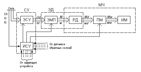 Электроприводом называется электромеханическое устройство, предназначенное для приведения в движение рабочих органов машин и управления технологическими процессами. ЭП состоит из преобразовательного, электродвигательного, передаточного и управляющего устройств. ЭП может быть автоматизированным и неавтоматизированным; первый в отличие от второго имеет систему автоматического управления (САУ) и обеспечивает рациональное ведение технологического процесса. Полиграфические машины последнего времени оснащены большим количеством электроприводов постоянного и переменного тока различной сложности – от простейших нерегулируемых электроприводов до сложных многоконтурных систем с подчиненным регулированием с двигателями постоянного и переменного тока различной мощности – от сотен ватт до сотен киловатт. Современная система автоматического управления электроприводом может быть успешно реализована при использовании последних достижений в области электроники, преобразовательной техники, микропроцессорной техники и электронных вычислительных машин.
